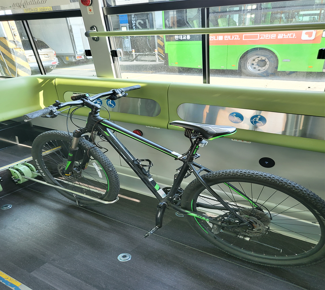 자전거 반입을 원하는 이용자는 휠체어 전용 공간에만 자전거를 세울 수 있다. 이 중 자전거 탑재가 가능한 차량은 휠체어 전용 공간에 좌석이 제거된 전기 버스만 가능하다. 다만, 휠체어 전용공간에 자전거를 반입하여 이동 중에 휠체어 이용자가 승차할 경우 교통약자 이동편의 증진법과 시내버스 운송사업 약관에 따라 자전거 승객은 중도 하차해야 하며, 이미 휠체어 이용자가 승차하여 이동 중인 경우에는 차내에 자전거를 반입할 수 없다. |
